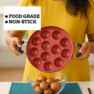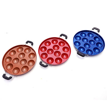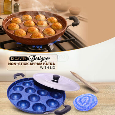 This 12 cavity nonstick Appam Patra helps you make a variety of delicious, healthy snacks right at home. Its designer colors and splatter finish add charm to your kitchen.