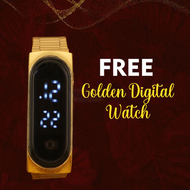 Introducing the ultimate accessory set for men: a combination of elegance and style with two stunning chains, a bracelet, and two rings, complemented by a sleek digital watch. The set features a Men�??s Golden Snail Design Chain with a golden finish. Accompanying it is a Men�??s Golden Diamond Chain, also with a golden finish. The Men�??s Golden Bracelet boasts a golden finish, adding a touch of sophistication. Additionally, the set includes a Men�??s Austrian Diamond Golden Ring, studded with Austrian diamonds and adjustable to fit. A second Men�??s Golden Ring, also adjustable, adds to the set's versatility. Completing the set is a Free Digital Watch with a rectangular dial, golden metal strap, and white LED display, featuring time, day, and date functions
