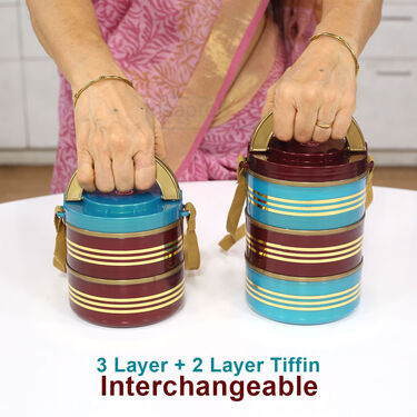 The interchangeable layers allow you to adjust the tiffin's capacity based on your meal size and portion needs, providing flexibility for different occasions