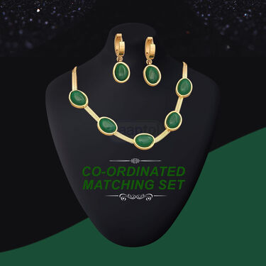 This exquisite jewelry set features a beautiful emerald green stone-studded chain, earrings, and a bracelet, all with a rich golden finish. Designed for elegance, it�??s the perfect accessory to add a pop of color and class to any outfit. The green stones contrast beautifully with the gold, creating a timeless piece that can be worn for both everyday wear and special occasions. Each piece is crafted to be lightweight and comfortable, making it ideal for long wear. With its elegant design and coordinated pieces, this set will surely elevate your jewelry collection.