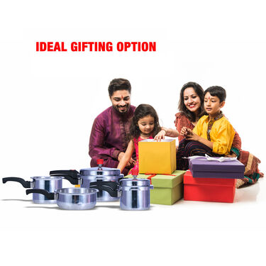 This pressure cooker combo includes four different capacities that may help cater to various cooking needs. Made from 100% food-grade aluminum, it may ensure safe cooking for your family. The ISI certification may guarantee quality and safety during use. Featuring essential safety measures like a vent tube and gasket release system, this product may prioritize your cooking safety. The ergonomic design, complemented by sturdy Bakelite handles, may provide comfort while handling hot dishes. Itâ??s gas stovetop compatible, making it perfect for everyday cooking. Ideal for making a variety of delicious Indian dishes, it may combine functionality with convenience. This unique combo may also serve as a thoughtful gifting option for any occasion