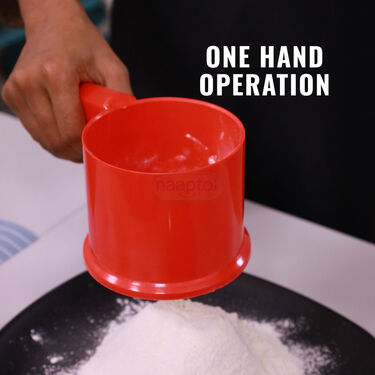 Upgrade your kitchen with this one hand operated flour strainer that scoops and sifts in seconds. Perfect for mess free, quick, and hygienic cooking every day.
