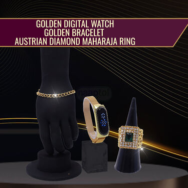 Upgrade your style with this exquisite golden combo featuring a digital watch, two chains, a bracelet, and a regal Austrian diamond-studded ring. Perfect for parties, weddings, or casual outings, it brings elegance and charm to every occasion.