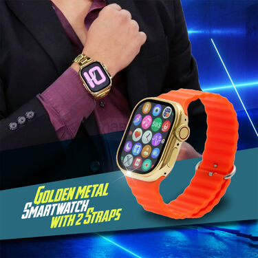 This stylish golden metal smartwatch with dual straps combines smart functionality and modern elegance. From answering calls to tracking your fitness, its your all in one everyday companion.