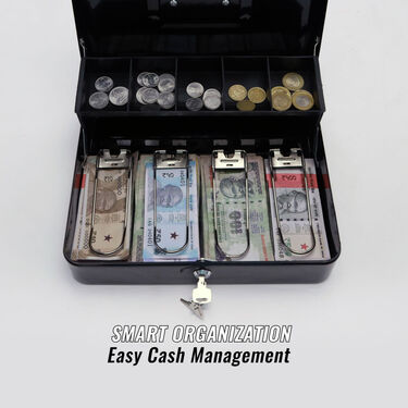The Metal Cash Box with Key Lock is a durable and secure storage solution for cash, coins, and valuables. Made from heavy-duty steel, it features a cantilever money tray with compartments for coins and additional space for bills, receipts, and documents. The key lock system ensures security, and the spring clips keep bills organized. Ideal for both indoor and outdoor use, this versatile box is perfect for homes, offices, stores, and more.