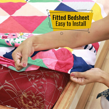 - Multi Colour Triangle Printed Fitted Double Bed Sheet with 2 Pillow Covers - This eye catching geometric print adds a splash of vibrant colours to your bedroom decor, instantly uplifting the mood and giving your space a fresh, modern touch.
