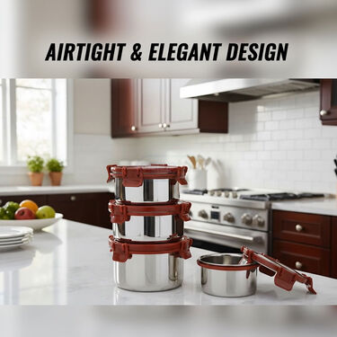 Upgrade your kitchen storage with this premium set of four stainless steel containers designed for maximum freshness and durability. Featuring a unique four side clip locking mechanism and food grade silicone gaskets, these containers offer a 100% airtight and leak proof environment for both dry and liquid foods. The non magnetic steel body is BPA free and odor resistant, ensuring your meals remain hygienic and flavorful for longer periods. Their stackable, space saving design makes them perfect for organized pantries, fridge storage, or as a reliable spill proof lunch box. Easy to clean and dishwasher safe, this versatile set is the ultimate eco friendly solution for a modern, healthy lifestyle.