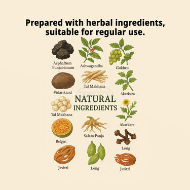 An Ayurvedic stamina and strength booster enriched with Shilajit, Ashwagandha, and Safed Musli. Crafted with 25+ herbs, it supports daily energy, vitality, and overall wellness naturally.
