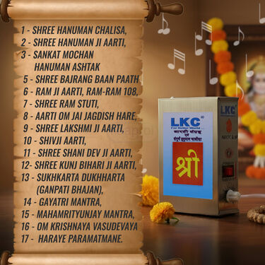 Experience the power of Hanuman Chalisa and 16 sacred mantras with this easy to use device. Its plug and play design and crystal clear audio bring spiritual peace to your home, shop, or festival celebrations.